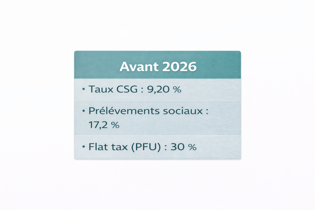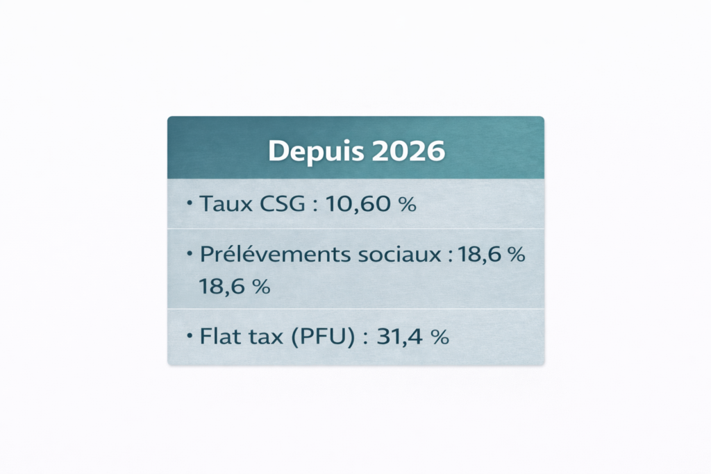 Depuis le 1er janvier 2026, la Loi de financement de la Sécurité sociale pour 2026 a modifié le taux de la Contribution sociale généralisée (CSG) sur une partie des revenus du capital.